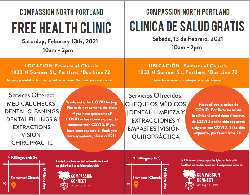 On February 13 from 10 am – 2 pm, Emmanuel Church will be hosting a Free Health Clinic with our partners Compassion Connect. We are asking everyone to help us to spread the word amongst your family, friends, community, and network. Emmanuel Church is located at 1033 N Sumner Street and is on bus line 72.