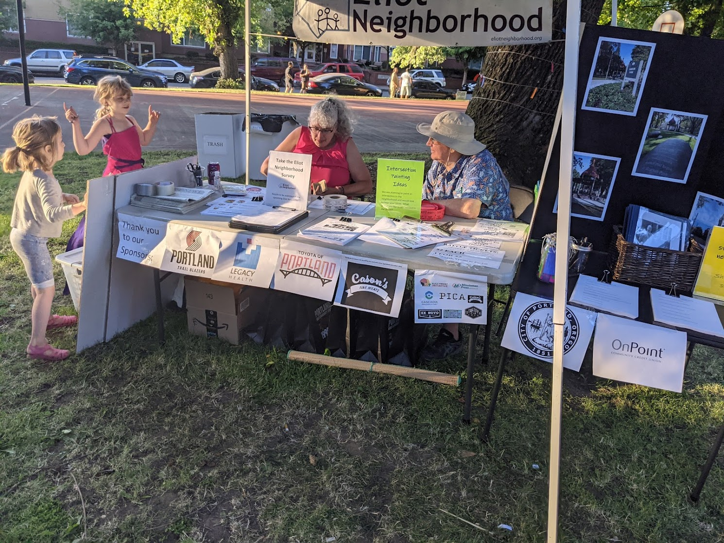 In the beginning, it was just an idea, “I’ll just put in the concert permit and kind of ‘fake it until we make it’”. We set up a page on our website to sign up for sponsors, volunteers, vendors and donation: eliotneighborhood.org/concerts. Meeting weekly, a team of 4 Eliot Board Members (Jennifer, Shireen, Sue and myself) built up trust, divided up tasks and started knocking down planning tasks. Over the course of 10 weeks we went from idea to reality, picking up some big sponsorships along the way. (see their logos to the left). The City of Portland lowered their permit fees substantially and gave us our largest grant, while many other local organizations chipped in big checks including Legacy Health, Toyota of Portland and the Trailblazers. Smaller donors started coming in but how would the event actually go?