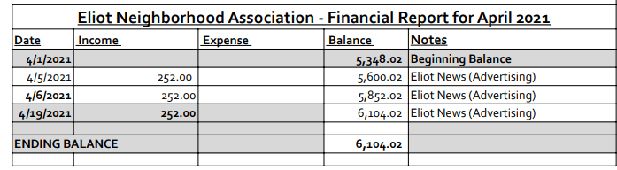 - No More Freeways Lawsuit: The Eliot Board signed onto the No More Freeways Lawsuit which has been filed. The purpose of the lawsuit is to delay the building of the freeway.