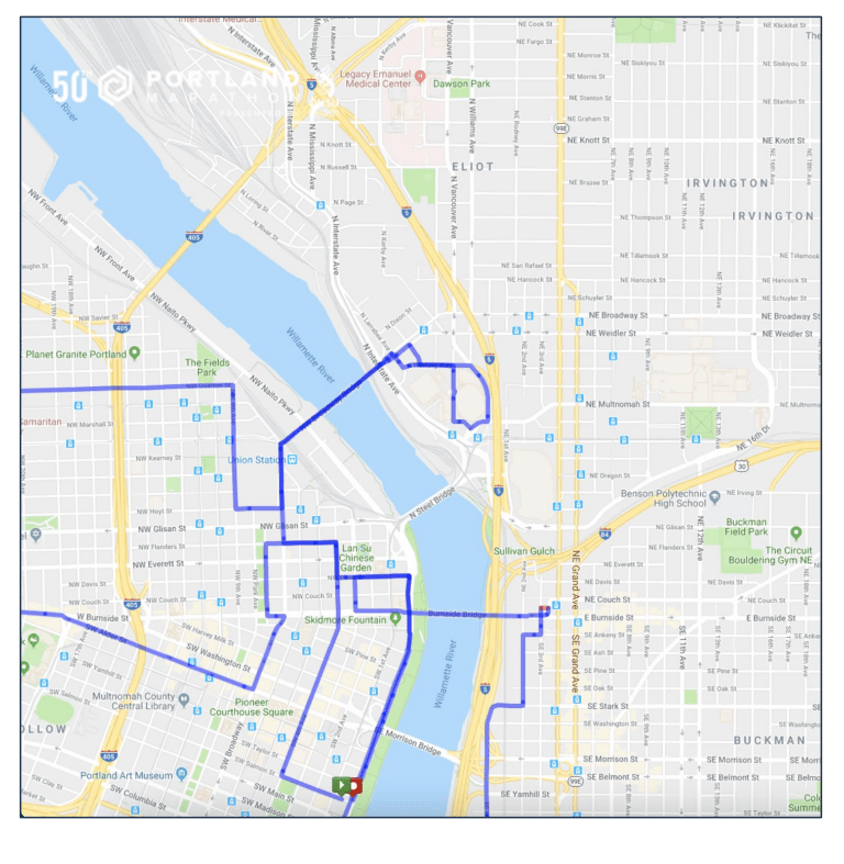 Although the actual race route does not enter Eliot, it will impact nearby streets. Runners begin the race Downtown and run through Old Town, Northwest District, and the Pearl District before accessing the Broadway Bridge. They then use the Broadway Bridge to cross to the east side and perform a clockwise loop around the Moda Center. The route then heads back west across the Broadway Bridge and makes its way south down Naito Pkwy into South Portland.