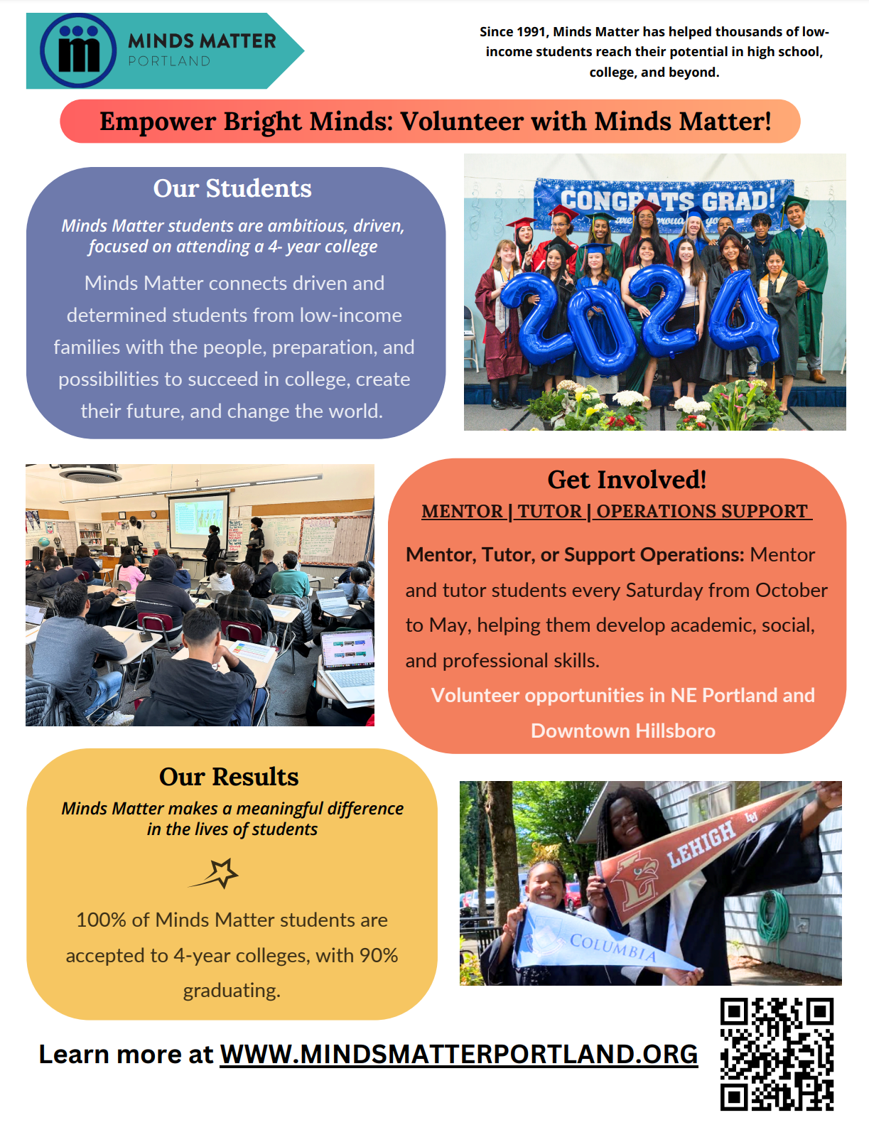 Minds Matter Portland helps ambitious low-income students achieve their dream of going to college. They provide guidance, resources, and hands-on opportunities to ensure that students develop the skills to successfully navigate the admissions process, their college years, and beyond. Given the recent Supreme Court ruling on affirmative action, volunteer action is ever more urgent and necessary to bridge the access gap for these promising young students.