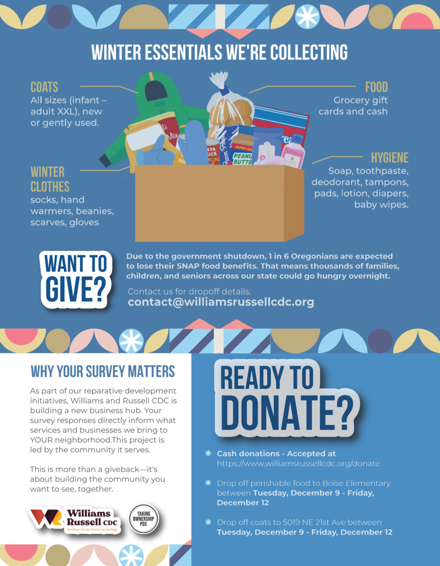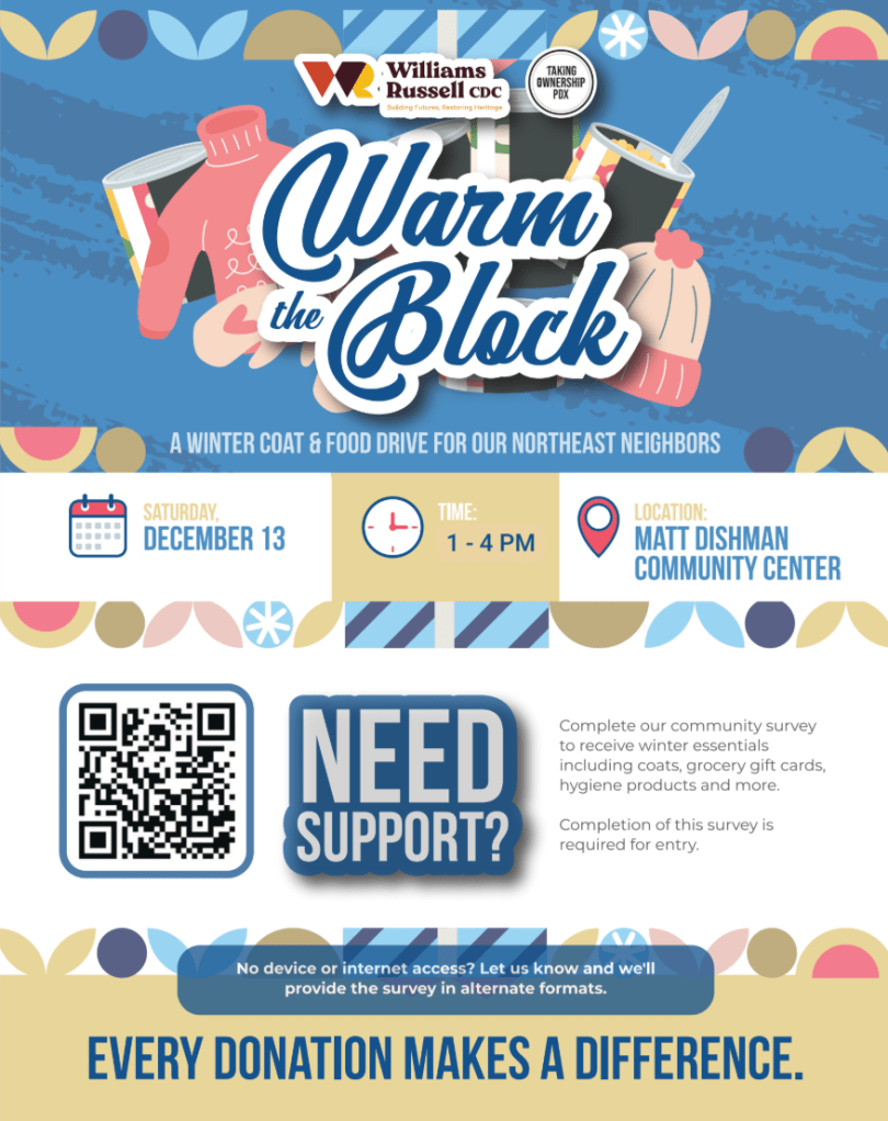 Warm the Block party at Dishman Sat Dec 13 1-4pm Posted on December 7, 2025December 6, 2025 by Eliot Neighborhood The Russell & Williams Community Development Corporation is hosting a ‘Warm the Block’ coat and food drive at Dishman this coming Saturday from 1-4pm. Details below Share this: Click to share on Facebook (Opens in new window) Facebook Click to share on X (Opens in new window) X Click to email a link to a friend (Opens in new window) Email More Click to share on Reddit (Opens in new window) Reddit Click to share on Tumblr (Opens in new window) Tumblr Click to share on Pinterest (Opens in new window) Pinterest Like Loading... Related