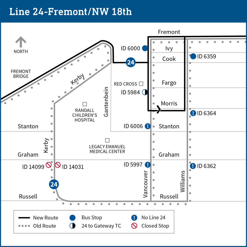 Map shows part of north Portland from N Russell St to N Fremont, with details of the old route for bus Line 24 side-by-side with the new route. The old route travels from the Fremont Bridge, down Kerby, turns east at Russell, and forms a loop on Vancouver and Williams past Russell, Knott, Graham, Stanchion, Morris, Monroe, Fargo, Cook, and Ivy before turning at N Fremont St. The new route eliminates the turn on Kerby, and instead continues generally east from the Fremont Bridge to N Fremont S, where it turns onto Vancouver, then Morris, then Williams, to form a loop back to Fremont. Stops 14099 and 14031 will be closed, and the following stops will no longer be included on Line 24: 5997, 6006, 6364 and 6362. Stop 5984 at Red Cross will become an eastbound stop to Gateway Transit Center.