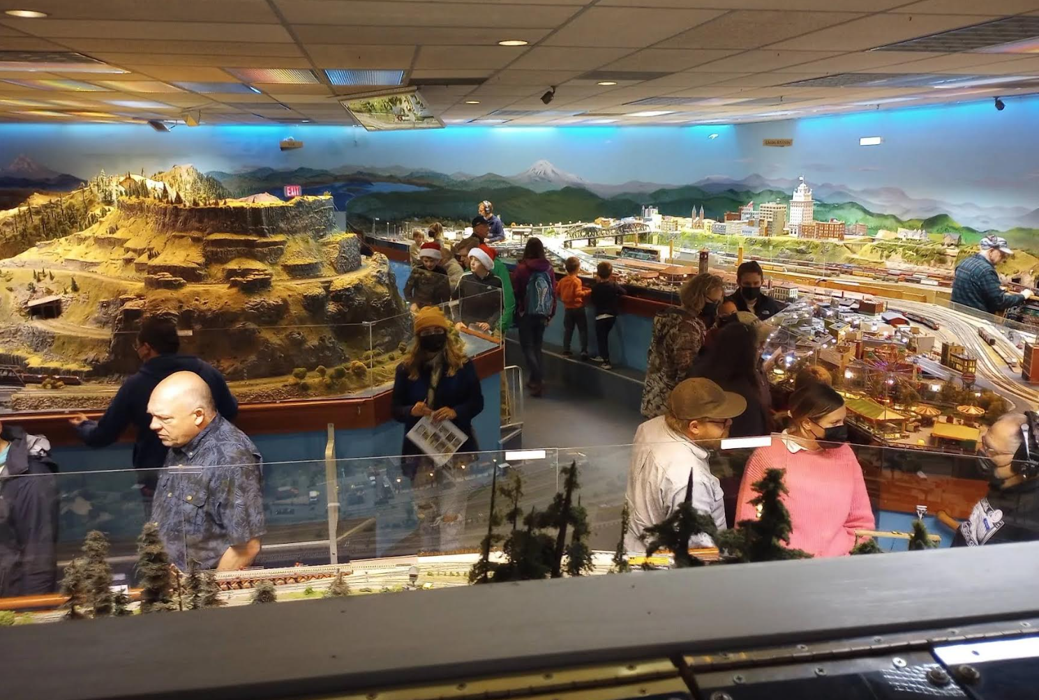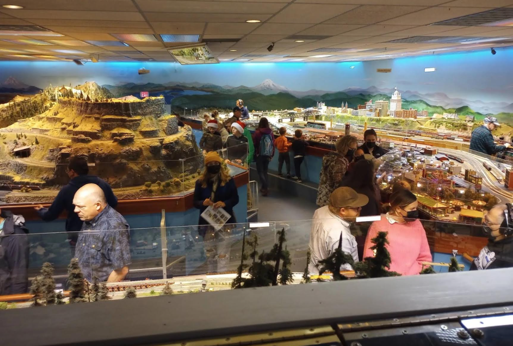 As you enter the layout, you’re first greeted by miniature Portland, set in 1957, complete with the society’s newest building (built in 2025) – Portland’s own Franz Bakery with its spinning loaf. In this miniature world where people stand just ¾ inch tall, no detail has been spared. Amusement rides really spin at Oaks Park, an animated woodchopper chops logs in Hood River, and coal cars transport fuel along the Oregon Trunk Line.