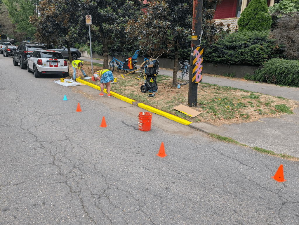 She asked various city staffers including PBOT’s Safe Streets program for ideas during community events. Considering PBOT budget limitations, she learned it might be necessary to do a little tactile urbanism. PBOT won a grant to paint 200 daylight corners but that doesn’t cover the need over all of Portland, it barely scratches the surface.