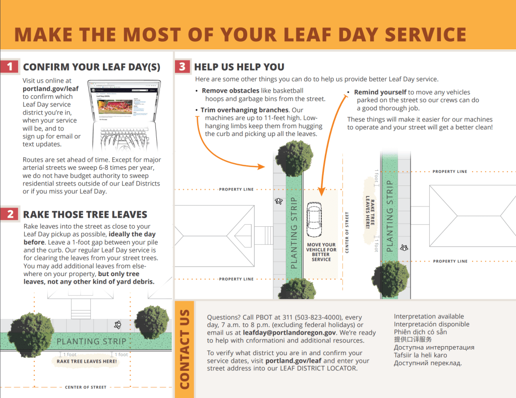 - Help your neighbors. People are still working from home in large numbers, with vehicles parked longer. Check in with your neighbors so everyone remembers to move their vehicles on Leaf Day.