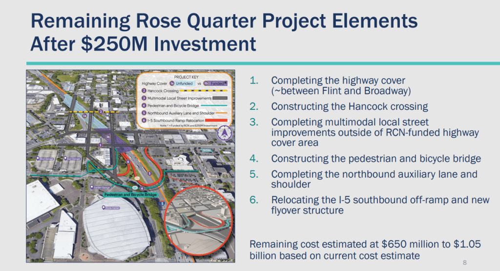 In a presentation to the Oregon Transportation Commission (OTC) this month, ODOT admitted that with their current available funding, they are limiting the scope of the project. Their ‘phase one’ would be minimal changes from the current I-5 travel patterns, but they would almost entirely to double the width of I-5. They hope additional funding arrives from the 2025 legislature to build the community components desired by the Eliot Neighborhood and others, but there is no guarantee that funding for these elements will be delivered any time soon (or ever).