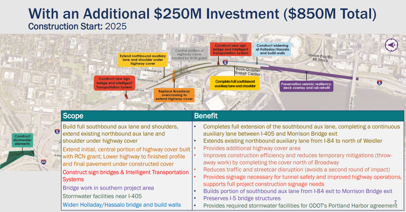 In a presentation to the Oregon Transportation Commission (OTC) this month, ODOT admitted that with their current available funding, they are limiting the scope of the project. Their ‘phase one’ would be minimal changes from the current I-5 travel patterns, but they would almost entirely to double the width of I-5. They hope additional funding arrives from the 2025 legislature to build the community components desired by the Eliot Neighborhood and others, but there is no guarantee that funding for these elements will be delivered any time soon (or ever).