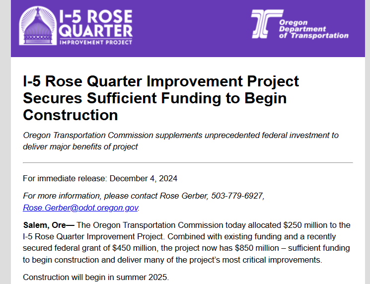 This month, ODOT issued a press release claiming the agency intends to start construction in the summer of 2025 on the proposed Rose Quarter Freeway Expansion Project despite ODOT only possessing 40% of the needed funding for the entire project and numerous legal hurdles in their way. The press release is designed to give this project as currently designed an air of inevitability, with ODOT issuing statements like “The I-5 Rose Quarter Improvement Project was created by the local community, City of Portland and ODOT working together to plan for changes coming in the future of inner north and northeast Portland. By building new separated bike lanes and wider sidewalks, improving the highway and creating new roadway connections, the project will create a better connected community, a more reliable I-5 and support economic growth.” (ODOT press release, 2018).