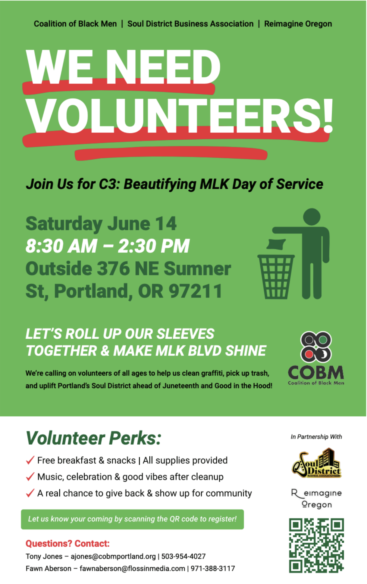 The Coalition of Black Men & Soul District Business Association are looking for volunteers of all ages to join them for graffiti removal, trash pickup, and neighborhood beautification. This is a powerful opportunity to come together in service, pride, and celebration of Portland’s historic Soul District.