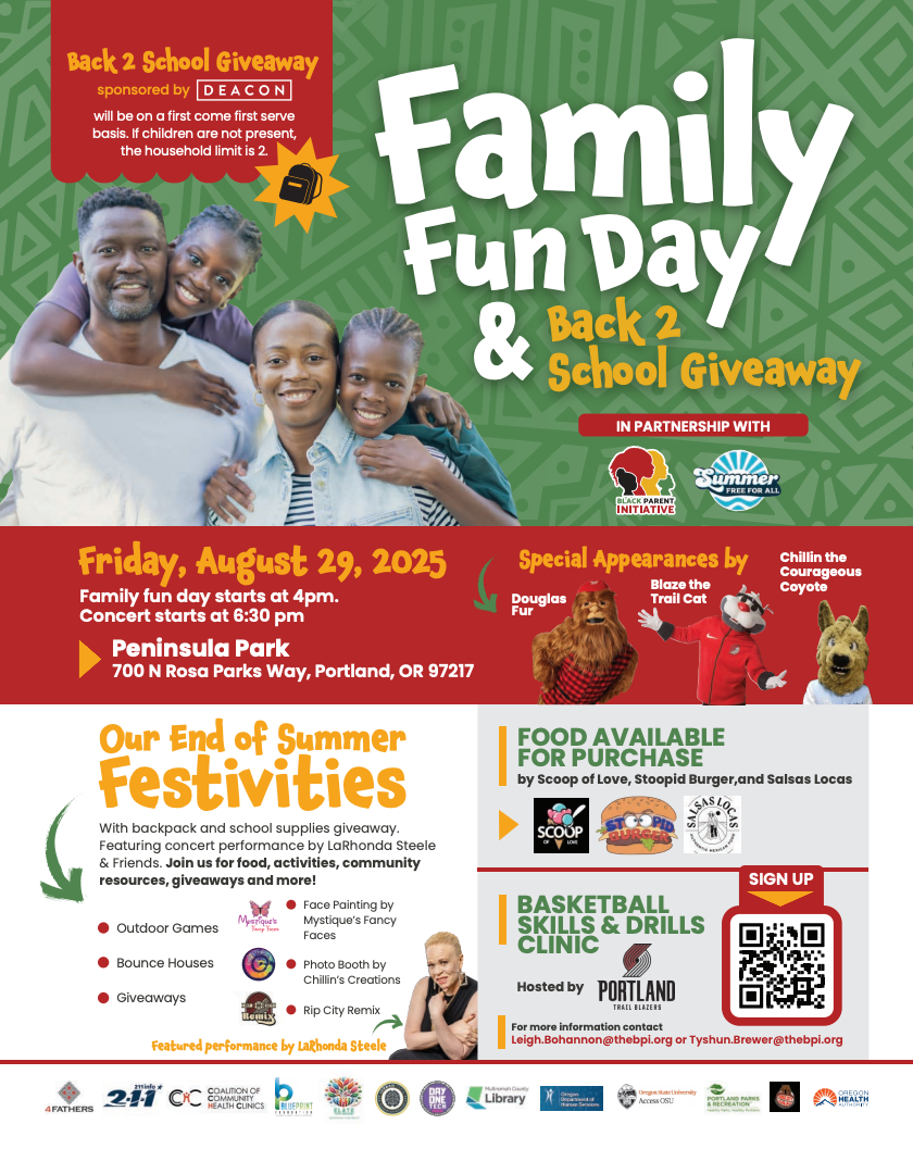 Join BPI for an end-of-summer celebration at Peninsula Park on Friday, August 29, 2025! The Family Fun Day & Back 2 School Giveaway, in partnership with the Summer Free For All Concerts in the Park will feature a free backpack and school supplies giveaway, a concert by LaRhonda Steele & Friends, outdoor games, bounce houses, and a basketball clinic hosted by the Portland Trail Blazers. There will also be food available for purchase and special appearances by local mascots.