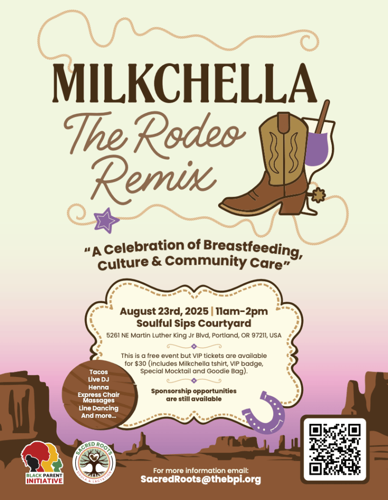 Milkchella: The Rodeo Remix is a free community event celebrating breastfeeding, culture, and community care. Hosted at Soulful Sips Courtyard, the event will feature a live DJ, henna, express chair massages, line dancing, tacos, and more. Attendees can also purchase VIP tickets for a special experience.