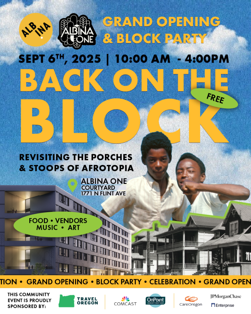 We’re just a few days away from Back on the Block, the grand opening celebration of Albina One. Join us this Saturday, September 6, from 10 AM to 4 PM for a day of live music, food, art, speakers, and community.