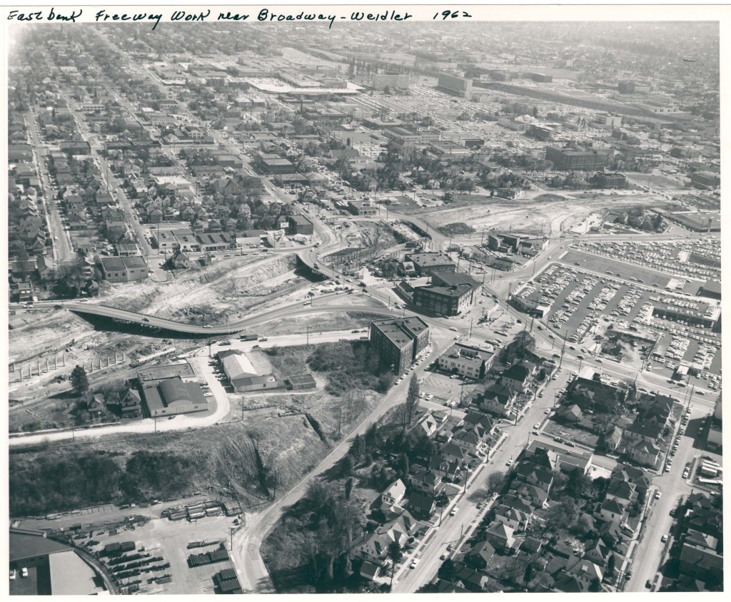 Eastbank Freeway Construction through the Broadway-Weidler Interchange in 1962. Photo courtesy Portland City Archives