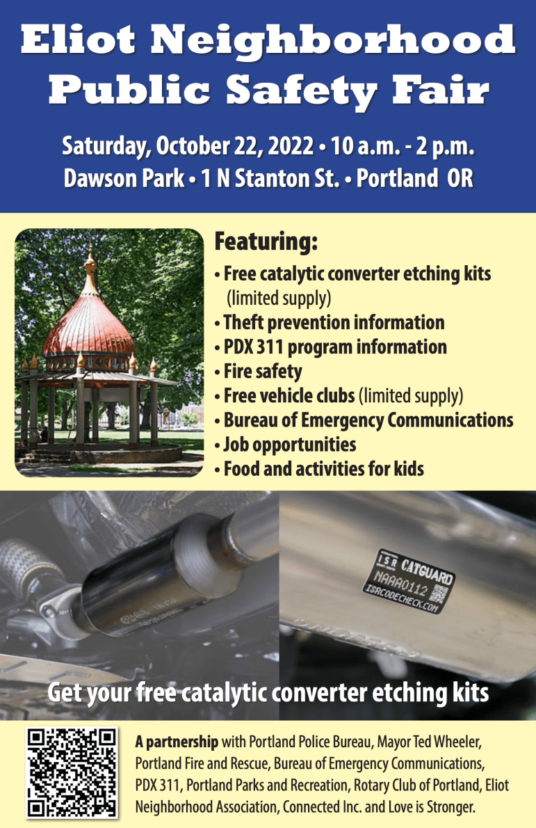 On Saturday, October 22 between 10am and 2pm, a Public Safety Fair will be held for the Eliot Neighborhood in Dawson Park. The fair will offer free catalytic converter etching kits, safety and theft prevention information and programs, job opportunities, and child-friendly food and activities.