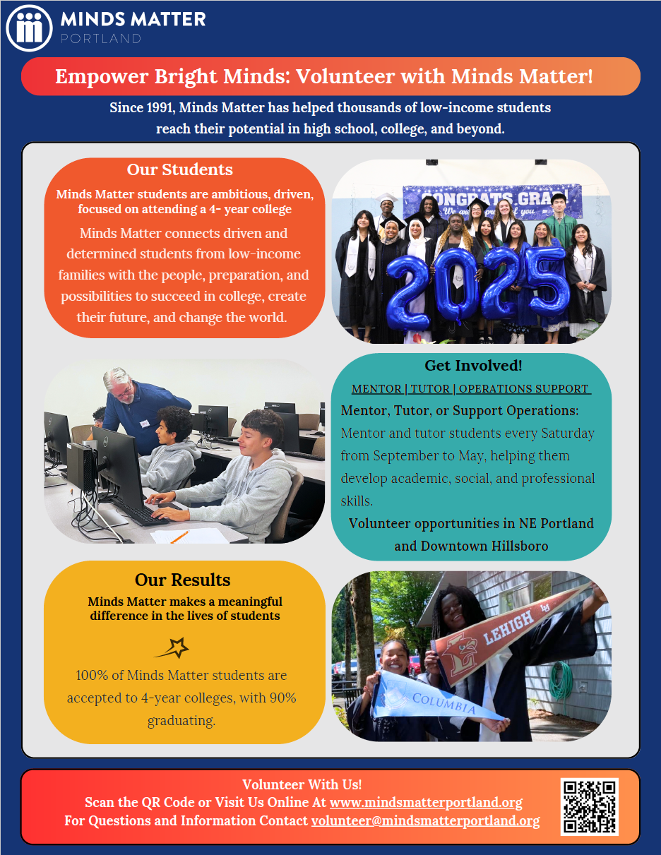 Minds Matter Portland empowers high-achieving, low-income students to reach their goal of attending and graduating from college. This 3 year mentoring program offers academic support and hands-on opportunities. Students gain the tools they need to navigate the college admissions process and thrive beyond it.