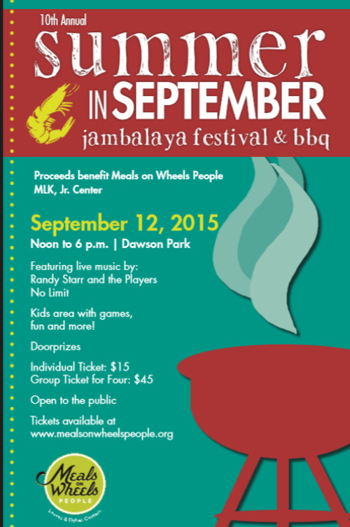 Meals on Wheels People Martin Luther King, Jr. Center will host the 10th annual Summer in September Jambalaya Festival & BBQ Saturday, Sept. 12, from noon to 6 p.m. at Dawson Park. Live musical entertainment will feature Randy Starr & The Players as well as BlowFrogz.