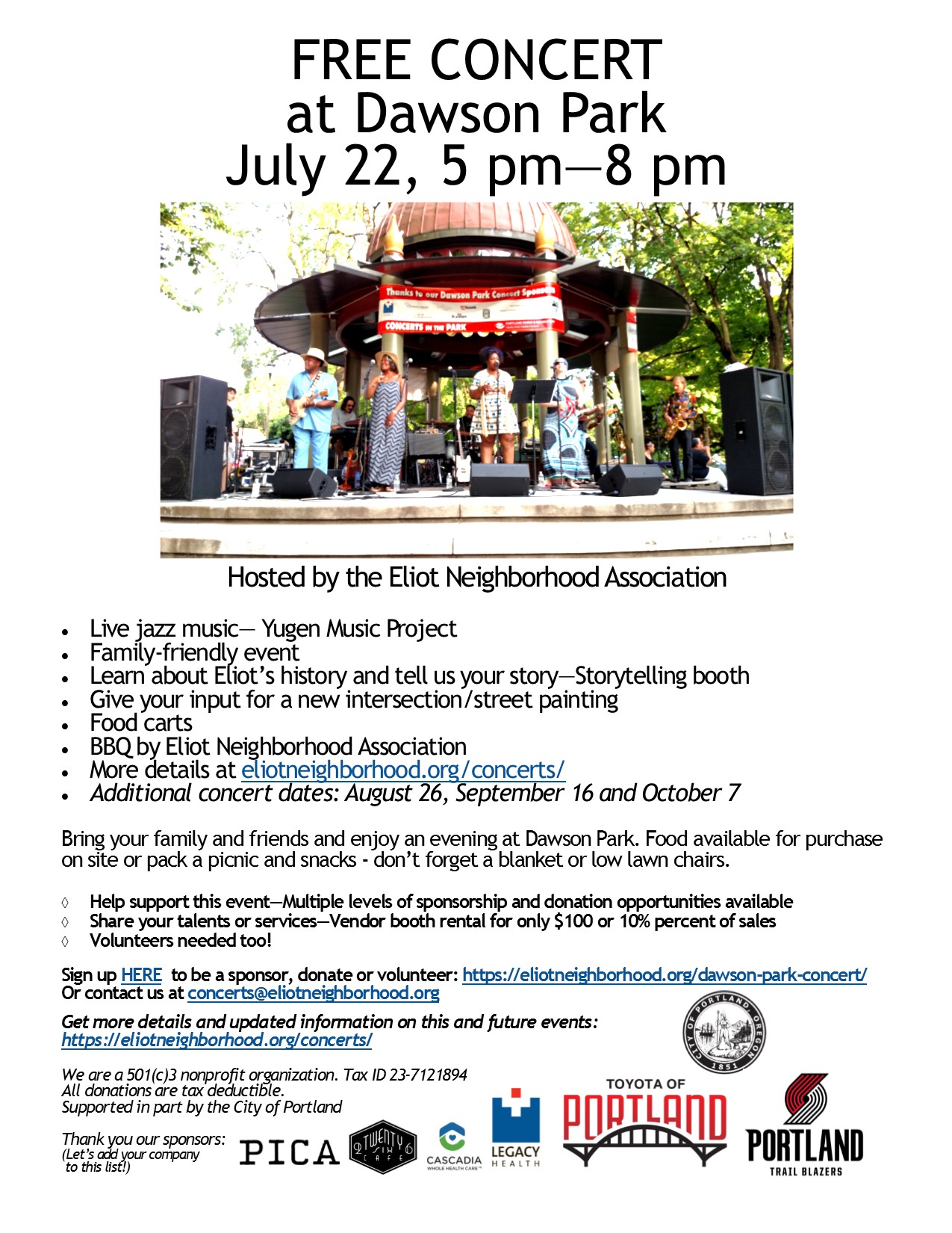Join us at Dawson Park Thursday, July 22 from 5-8pm for a free jazz concert and family-friendly event. See the flier below for more details and also visit the website CONCERTS page here for more details and to sign up to be a sponsor, vendor, volunteer or just to donate.