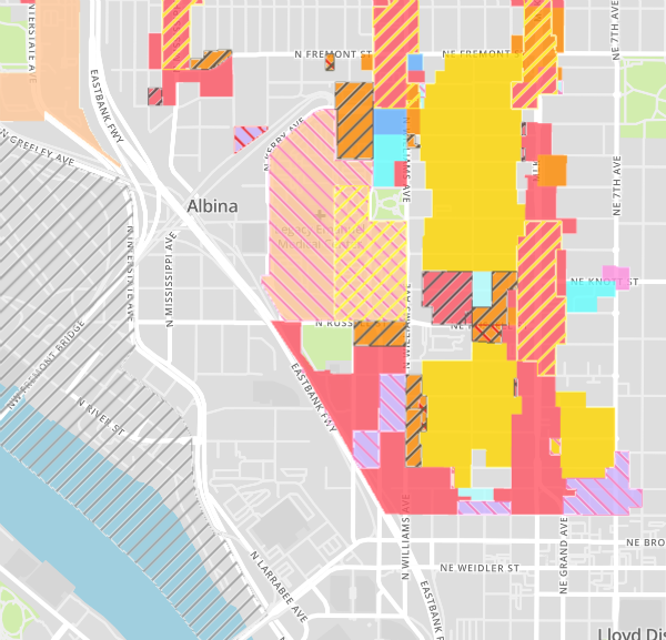 During the pandemic, I have been doing a lot of reading about the history of my neighborhood, Eliot. I came across a number of plans from the 1960’s and 1970’s that affected inner North Portland. Joseph Cortright put together a 3-part series on how the Oregon Department of Transportation destroyed Albina, the biggest cultural center for Black Portlanders at the time. At the same time, Emanuel Hospital was expanded intentionally into the area between N Williams and N Kerby all the way to I-5/I-405. This was presaged by a short study called the Central Albina Study which recommended most of what is now the Eliot Neighborhood be demolished for Industry. Warehouses were recommended west of MLK Jr Blvd and South of N Fremont. This was later amended to west of N Williams avenue.