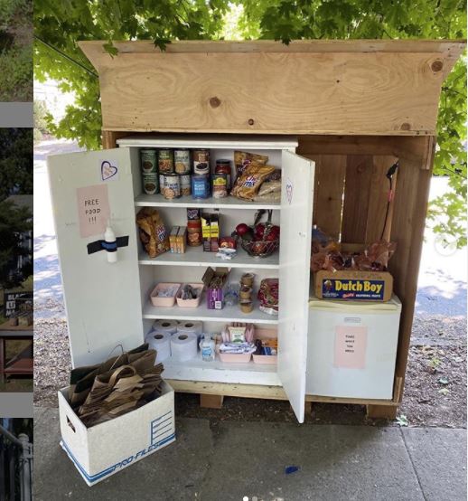 After purchasing a reasonably priced pantry from a neighbor, Harvey filled up the pantry with food and toiletries and placed it in the parking strip in front of her home. She added hand sanitizer, a mini-fridge, and a box with grocery bags for ease of carrying away food and supplies. A friend of hers was working with PDX Free Fridge and linked Harvey up with the organization. They listed her pantry on their food pantry map and also, at no cost to her, built a structure to house the pantry to keep it weather-resistant this winter. It has been a great partnership.